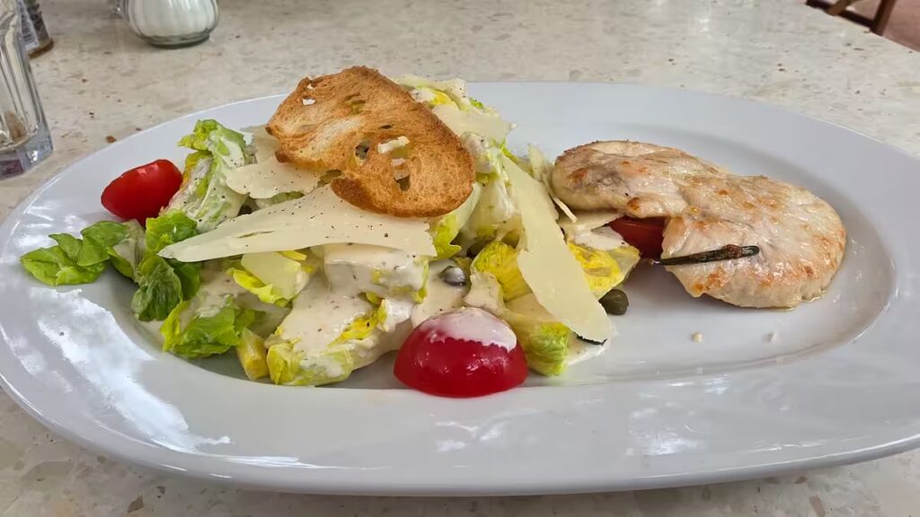 We ordered two dishes: a Caesar salad and a Burrata auf Salat mit ½ getrockneten Tomaten & Pesto (Burrata on salad with sun-dried tomatoes and pesto). The Caesar salad was a classic—crisp romaine lettuce, crunchy croutons, and a creamy dressing with a good balance of garlic and anchovy notes. The parmesan shavings added a nice touch, though the portion felt a bit modest for the price. It was fresh and satisfying, but nothing extraordinary.