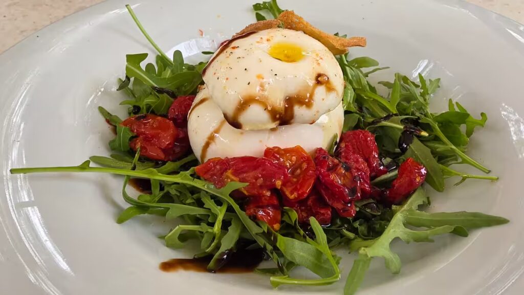 The Burrata dish, however, stole the show. The creamy burrata paired beautifully with the tangy sun-dried tomatoes and the vibrant, herby pesto. The salad base—mostly arugula with a light olive oil dressing—added a peppery freshness that complemented the richness of the cheese. The portion was generous, and the flavors felt vibrant and well-balanced, making it a perfect light meal for a sunny day in the park.