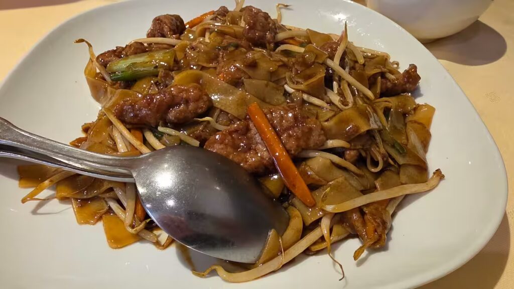 To finish, we shared a dish of wide stir-fried rice noodles with sliced beef and bean sprouts. It was generously portioned, fragrant with soy sauce, and perfectly seared in the wok, giving it that irresistible smoky flavor. The beef was tender, the vegetables stayed crisp… a real delight.