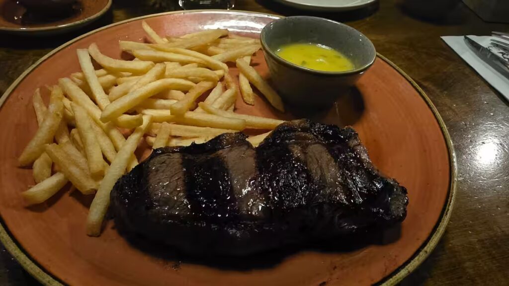 We opted for a charcoal-grilled steak, served still sizzling, with that distinct smoky aroma of fire and embers. The cut was tender, juicy, and cooked to perfection, with a golden crust on the outside and a melt-in-your-mouth center. You can tell the cooking is precise, but above all, it respects the quality of the meat.